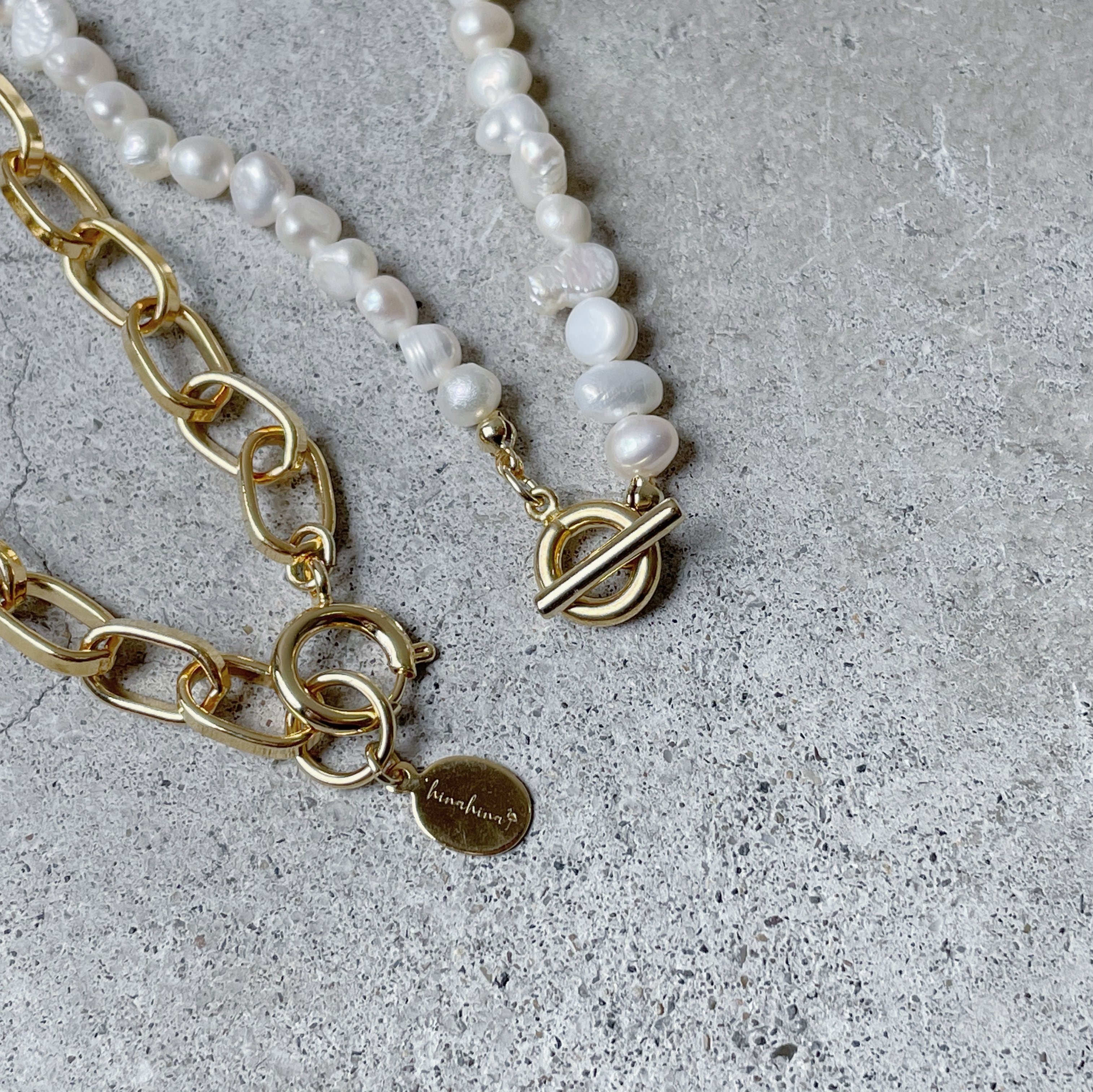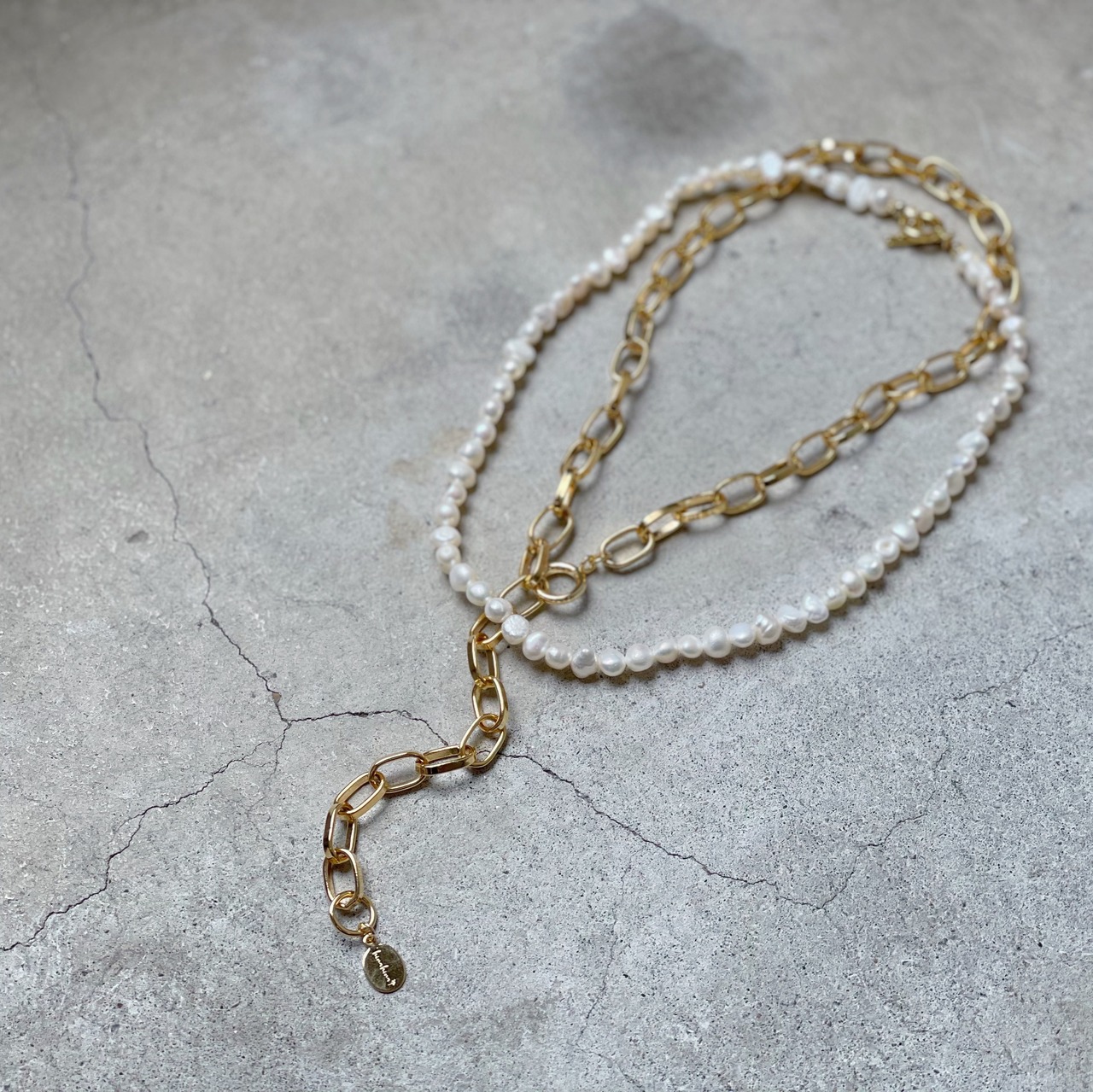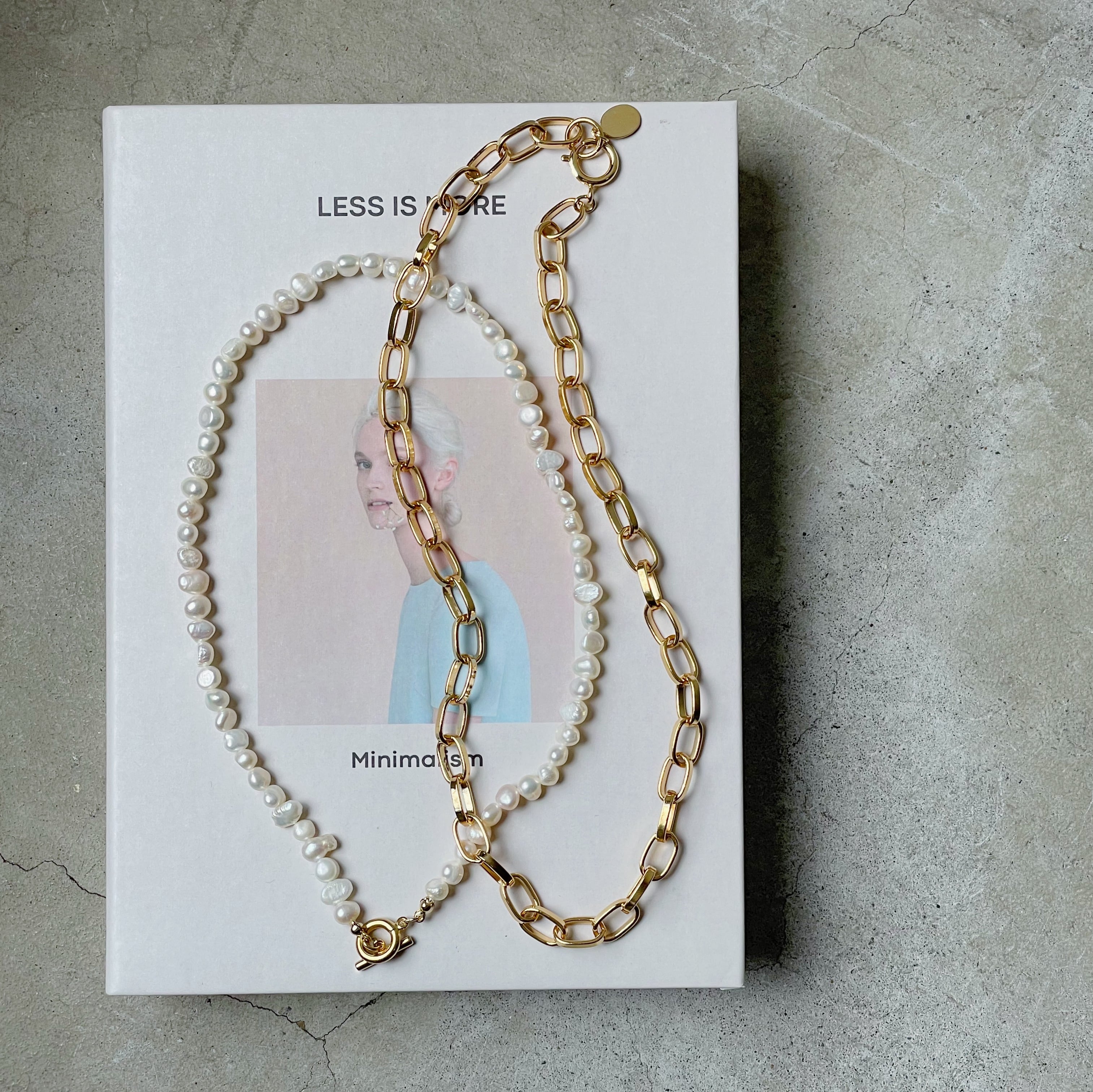 自然が作り上げたポテト形状のバロック淡水パールと存在感放つ太めチェーンネックレスの2本