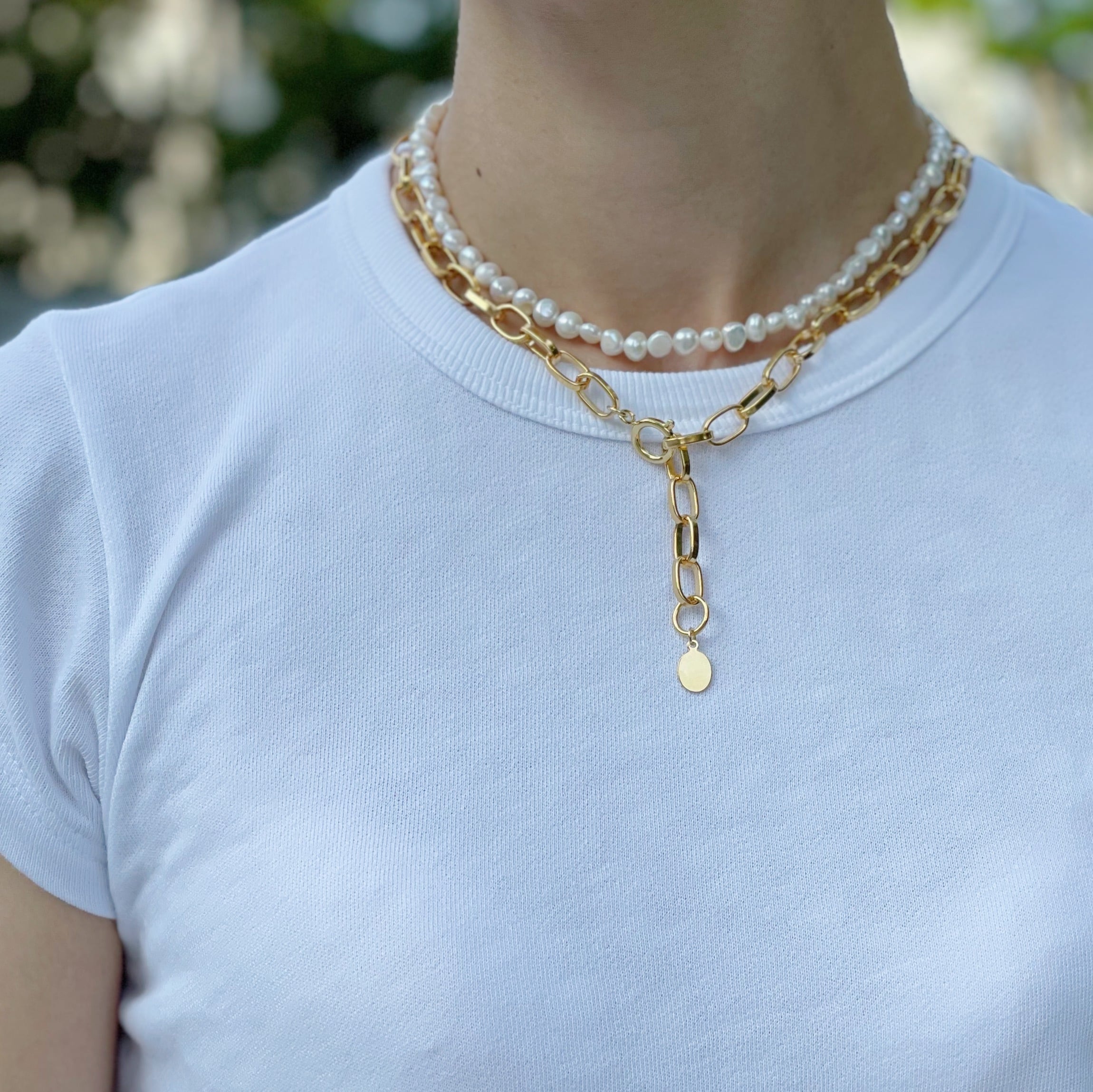 1点投入でもオシャレ度がぐんっと上がる厚みのある太めチェーンにエレガンスなパール一連を重ねることでメリハリが生まれより効果的にデザインを楽しめます。
